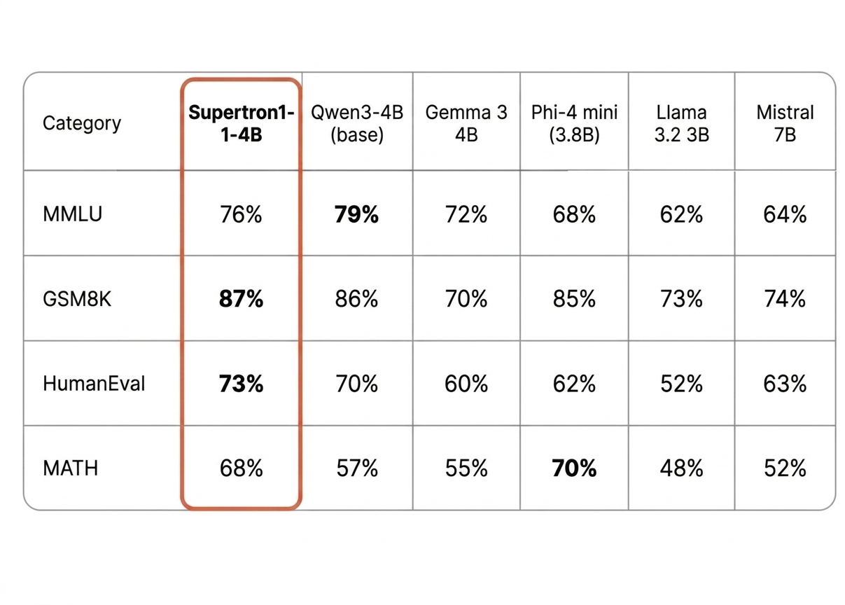 Supertron1-4B holds its own against models in the 4–8B class and surpasses Mistral 7B on all four core benchmarks despite having nearly half the parameters.