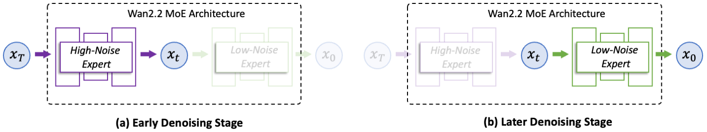 Wan2.2 introduces Mixture-of-Experts (MoE) architecture into the video generation diffusion model. MoE has been widely validated in large language models as an efficient approach to increase total model parameters while keeping inference cost nearly unchanged. In Wan2.2, the A14B model series adopts a two-expert design tailored to the denoising process of diffusion models: a high-noise expert for the early stages, focusing on overall layout; and a low-noise expert for the later stages, refining video details. Each expert model has about 14B parameters, resulting in a total of 27B parameters but only 14B active parameters per step, keeping inference computation and GPU memory nearly unchanged.