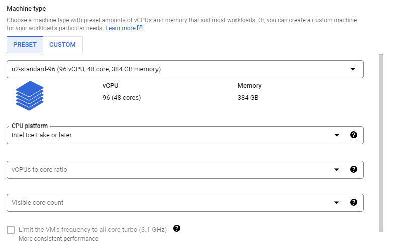 Visit google cloud console and click on create a VM under your project. Then, follow the below steps to create a single 96-vcpu instance which corresponds to one Intel Ice Lake CPU socket.